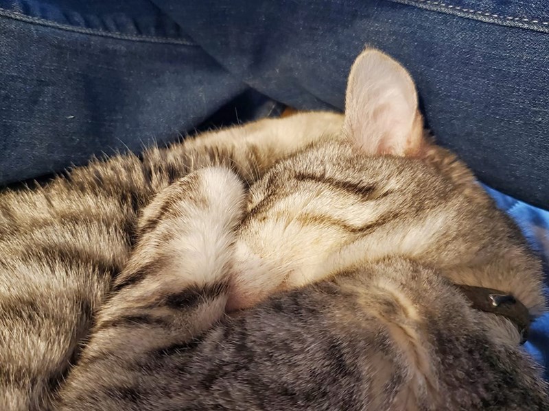 "Ashlee came to us as a stray. No one came forward so we adopted her. Kept her in a separate room for a little while to get acclimated to her new home and fur senior sister. I left her there and went to say good morning and she's nowhere to be found. I'm in full panic mode. She's not under the bed. Not in the closet. Where is this cat !!!?? So I pulled up the mattress and there she was. Crazy girl ripped a hole in the bottom of the box spring and climbed in it. Lol."
