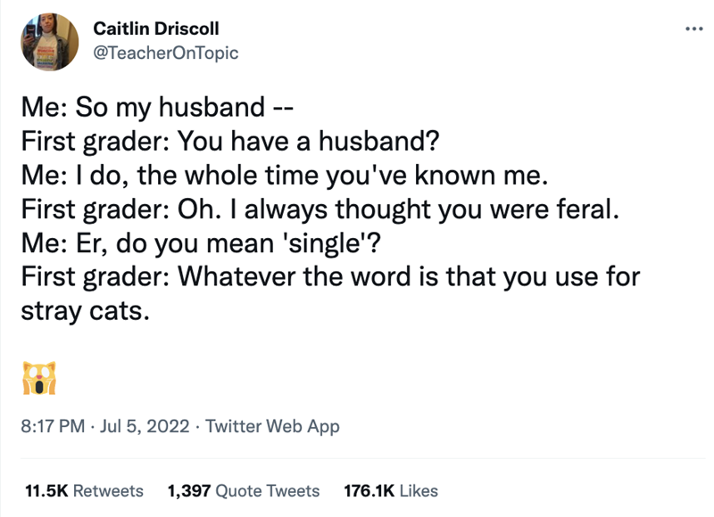 "Me: So my husband -- First grader: You have a husband? Me: I do, the whole time you've known me. First-grader: Oh. I always thought you were feral. Me: Er, do you mean 'single'? First-grader: Whatever the word is that you use for stray cats."