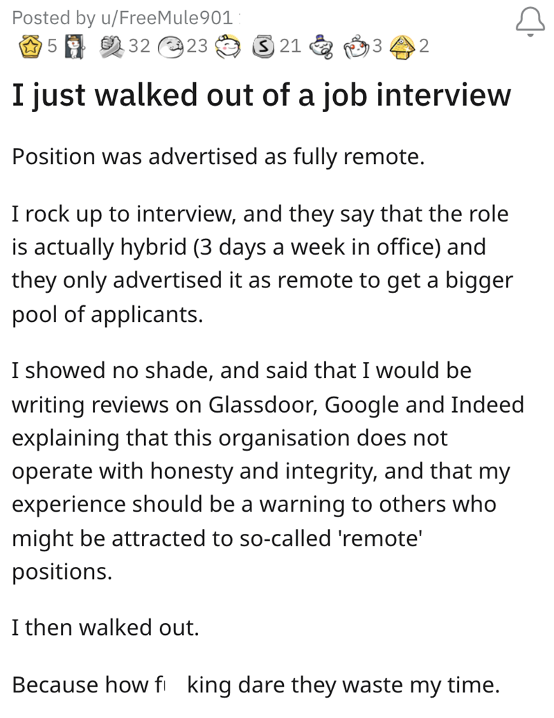 This job candidate was quick to turn heel and bolt when it became abundantly clear that the interviewer had been intentionally misleading in their description of the role. The role had been advertised as being remote work when it was actually "hybrid," requiring some attendance to an office space. To top it off, the interviewer even admitted that they had advertised it as such in order to increase the pool of applicants.