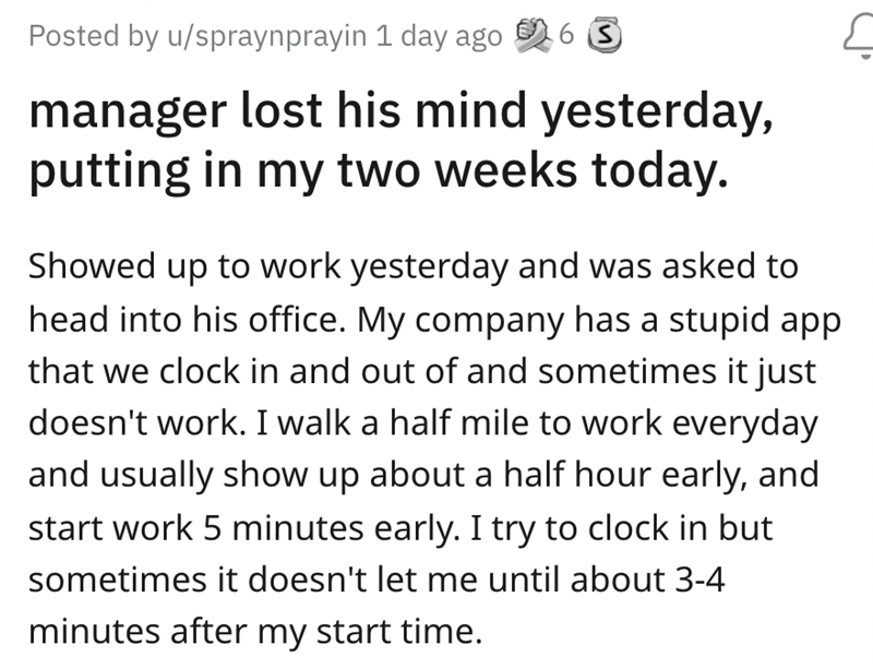 This thread was posted to Reddit's r/antiwork subreddit by Redditor u/spraynprayin. They shared their experience with readers to vent and seek advice, which they were more than happy to do in the comments.