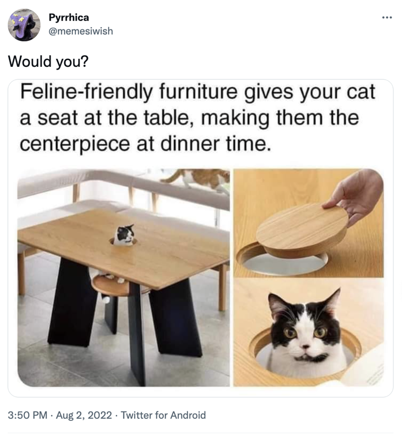 "Would you? Feline-friendly furniture gives your cat a seat at the table, making them the centerpiece at dinner time."