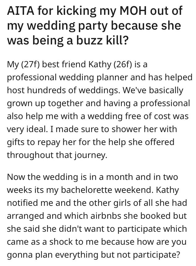 Here's the scoop. u/Final_cream6177 enlisted her best friend Kathy, a professional wedding planner, to be her MOH. Kathy had planned countless weddings before, and everything seemed to be going smoothly. That is, until a couple of weeks before the bachelorette when Kathy began to personally opt out of some of the plans she made for the bridal party. When the bride confronted her about it, Kathy expressed discomfort about drinking alcohol and the stripper portion of the weekend. The bride felt "heartbroken" and tried to discuss it with Kathy to see if she would change her mind, but no dice. Kathy made her decision, which prompted the bride to abruptly dismiss Kathy from her Maid of Honor duties and the bridal party entirely. When u/Final_cream6177 shared what happened with the other members of her party (and later, on Reddit), the responses she got were less than comforting.