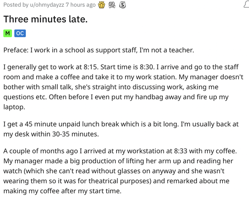 Employee Stands His Ground With Manager After Getting in Trouble for Being Three Minutes Late