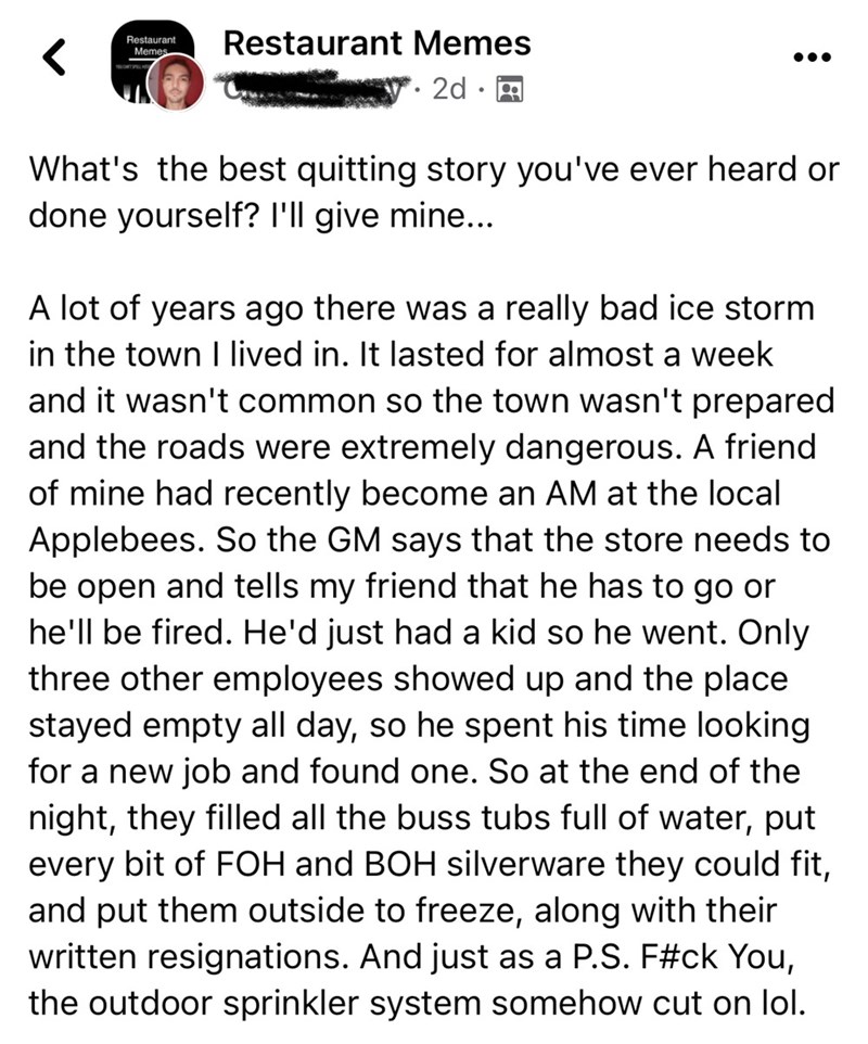 After having worked as a bartender at parties that required pouring wine and opening beers, I was hired by a bustling seafood restaurant in the West Village. They knew my bartending skills were limited, but after hiring me as a server, had me work my second training shift as the sole bartender on a Friday night. After an hour of fumbling, apologizing, and embarrassment, I took my apron, calmly folded it up, and walked out. They weren't happy about this, but it was incredibly unprofessional for them to put me in that situation. It's also a surefire way to get some negative Yelp reviews. Good riddance.