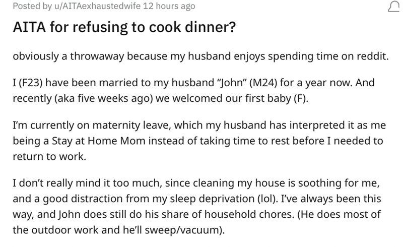 This thread was posted on Reddit's r/AmITheA**hole subreddit by u/AITAexhaustedwife, who expressed frustration about the physical and emotional labor she has had to take on since giving birth. Cleaning the house during the day doesn't seem to be the issue; in fact, she described that as therapeutic for her. But the expectation of having dinner cooked for your spouse when they return from work is not only completely backwards, it's unrealistic, especially with a baby to take care of 24/7.