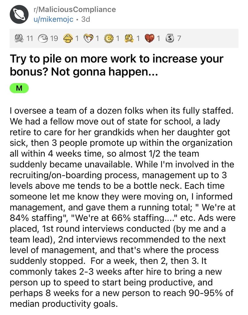 This post was originally posted to Reddit's r/MaliciousCompliance subreddit by Reddit user u/mikemojc, who shared their story to the popular subreddit with the title "Try to pile on more work to increase your bonus? Not gonna happen..."
