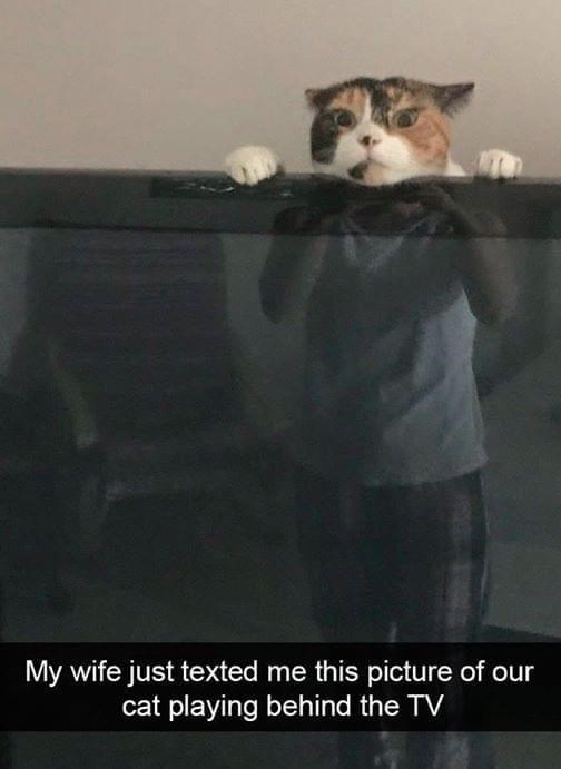 We do love it that our priorities, as cat people, are completely upside down. Instead of rushing toward this cat and getting it the heck away from the TV - because this moment is clearly a disaster waiting to happen, this person picked up their phone and took this photo. RIP TV, we know you couldn't have possibly lasted long after this.