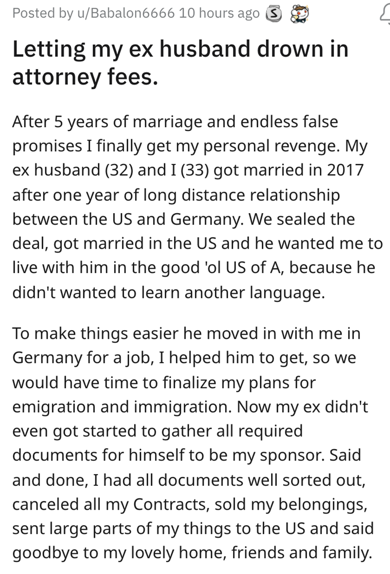 "So you told his lawyer what needs to happen per German law for you to finalize the divorce and the lawyer hasn't arranged for the necessary paperwork? His lawyer is playing him as much as you are!!!" replied user nygrl811.