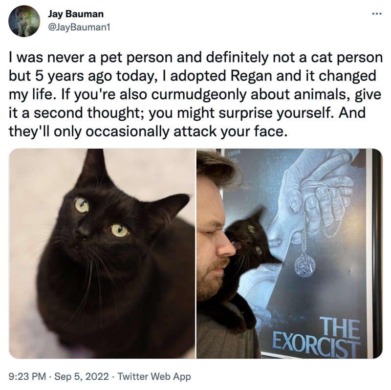 "I was never a pet person and definitely not a cat person but 5 years ago today, I adopted Regan and it changed my life. If you're also curmudgeonly about animals, give it a second thought; you might surprise yourself. And they'll only occasionally attack your face. "