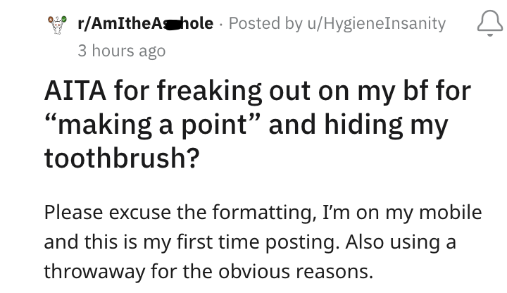 If you're looking to get dumped, feel free to do exactly what this guy did! When he learned that his girlfriend of four months tends to brush her teeth first thing in the morning before going back to bed in case any early ~activities~ occur, he thought her preoccupation with her own breath was a problem. This thread was posted to Reddit's r/AmITheA**hole subreddit by u/HygieneInsanity, the girlfriend in question.