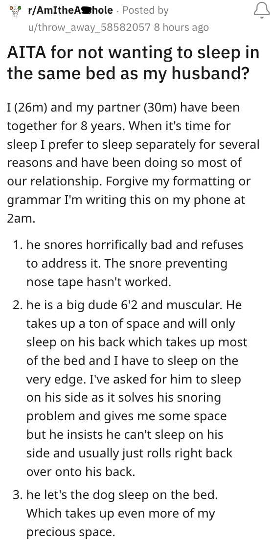 'If you want to see me in the morning, walk to the couch, there I am': Snoring husband requires partner to sleep in his bed