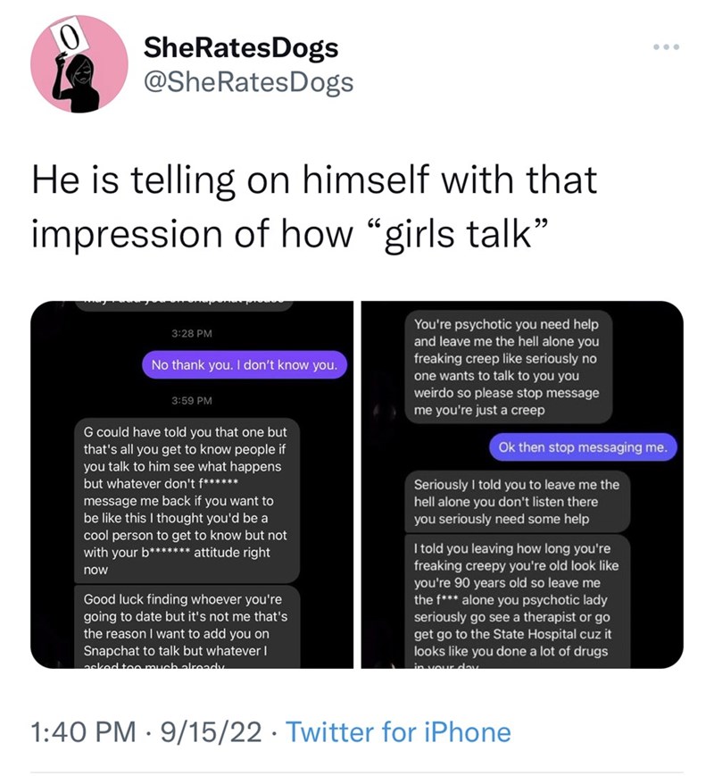 The messages that follow are an unhinged collection of sentences that are dripping with entitlement, incel behavior, and intense cringiness, all at once. Instead of going about the rest of his day, and leaving his crush alone, he opts to “be like a girl” and respond in ways we can only gather women respond to him. He starts calling her a creep, and psychotic, and perhaps most tellingly says that she looks like she's 90 years old.
