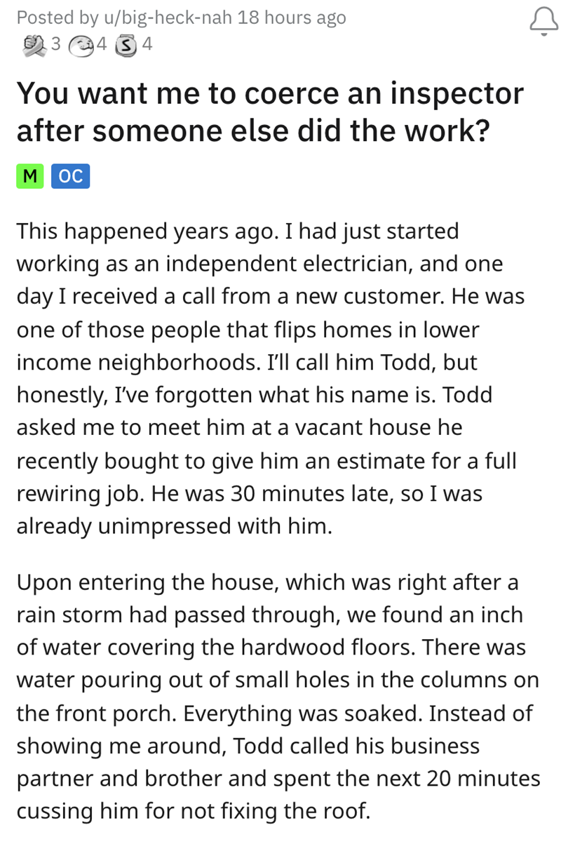After watching the client go off on his business-partner brother, this electrician quickly realized that they didn't want to work with a short-tempered house flipper. The electrician gave the client his "I don't want to do this job" price, which led the client to go with another electrician. When the client contacted them months later to meet with the inspector, it became instantly apparent that the workmanship was inferior and not up to code.
