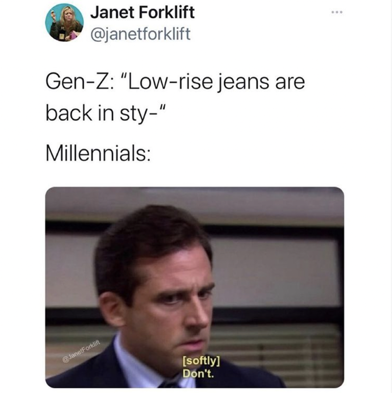 Millennials wore low-rise jeans, so Gen-Z could run. Literally. Have you ever tried running in low rise jeans? It doesn't matter if you used wet cement as a belt, those things are falling down. But seriously, why Gen-Z, why would you do this to yourselves? Like, Millennials are flattered that you want to emulate the style we made popular back in the early 2000s, but we learned our lesson and now we are telling you it's a mistake. Listen, it's not about how it looks. Yes, millennials are getting old and our bodies can't fit into low-rise jeans like the used to, but this isn't about jealousy. The amount of eating disorders these style of jeans created is still plaguing many of us even today. So we're just a little worried. That's all. By all means, do whatever style or trend you want! Millennials have no place in telling someone not to take risks when it comes to fashion—we were all about that! Just, read the memes and sleep on this whole bringing low-rise jeans back thing…