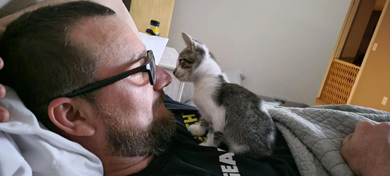 What did we tell you? Look! Look at the crimes being committed by this kitten. Not only did this kitten win over this man's wife, forcing her into taking it in despite her husband's requests, but clearly, this kitten has also taken over the husband's heart. And we can't even blame him. Look at this precious thing.
