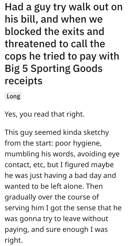 Customer Does Everything to Avoid Paying His Bill At Restaurant, Even Trying to Use Sporting Goods Store Credit