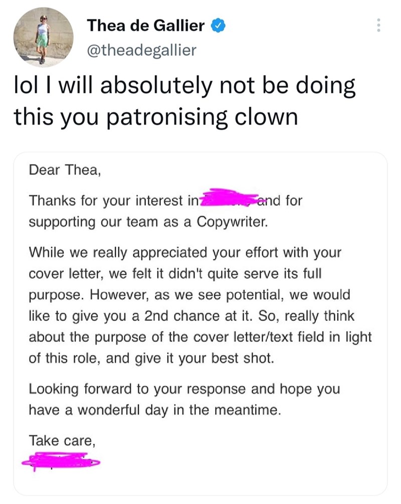 Most of us are no stranger to the wonderful world of rejection when it comes to looking for a new job. However, it is truly baffling how companies seem to find new and even worse ways to serve us this humiliation with every passing day. For the right role, some of us may jump at a second chance — but this wasn't the case for @theadegallier, who expressed her horror at the application rejection that she received for a copywriting role. In an email, the hiring team claimed that her cover letter for the role "didn't quite serve its full purpose". Inviting her to try again without specifying what they wanted done differently, others on Twitter were equally put off by this brazen approach to applicants. In this world of quiet quitting and knowing your worth, it's fair to say that this approach isn't going to fly with a lot of people, especially if they're applying for a lot of roles.