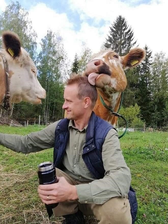 "Ooohh, what's this? A new hooman? This doesn't look like the regular hooman that takes care of me and feeds me. But I guess hoomans come in all shapes and sizes. Okay, gotta give him a smooch. Come closer! Smooooch"