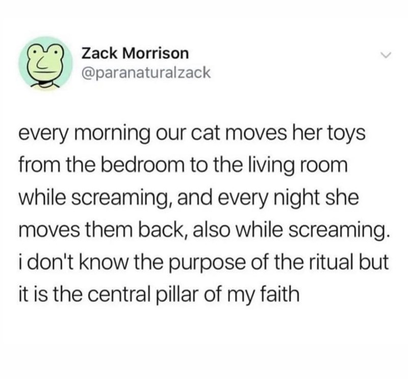 "every morning our cat moves her toys from the bedroom to the living room while screaming, and every night she moves them back, also while screaming. i don't know the purpose of the ritual but it is the central pillar of my faith"