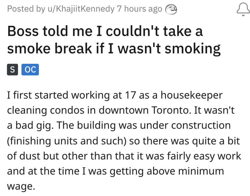 I previously worked in an office where I was one of two non-smokers; everyone else was a smoker, and I, like this dude, wanted in on that "15-minute break every 45 minutes" action. To make matters worse — the boss smoked too — and you were at a serious disadvantage socially and politically in the office if you weren't in on these smoking break meetings. I'm not as smart as the OP of this story, so I actually started smoking cigarettes (sorry Mom) so that I could go outside with them for a smoking break. Don't do that, kids.