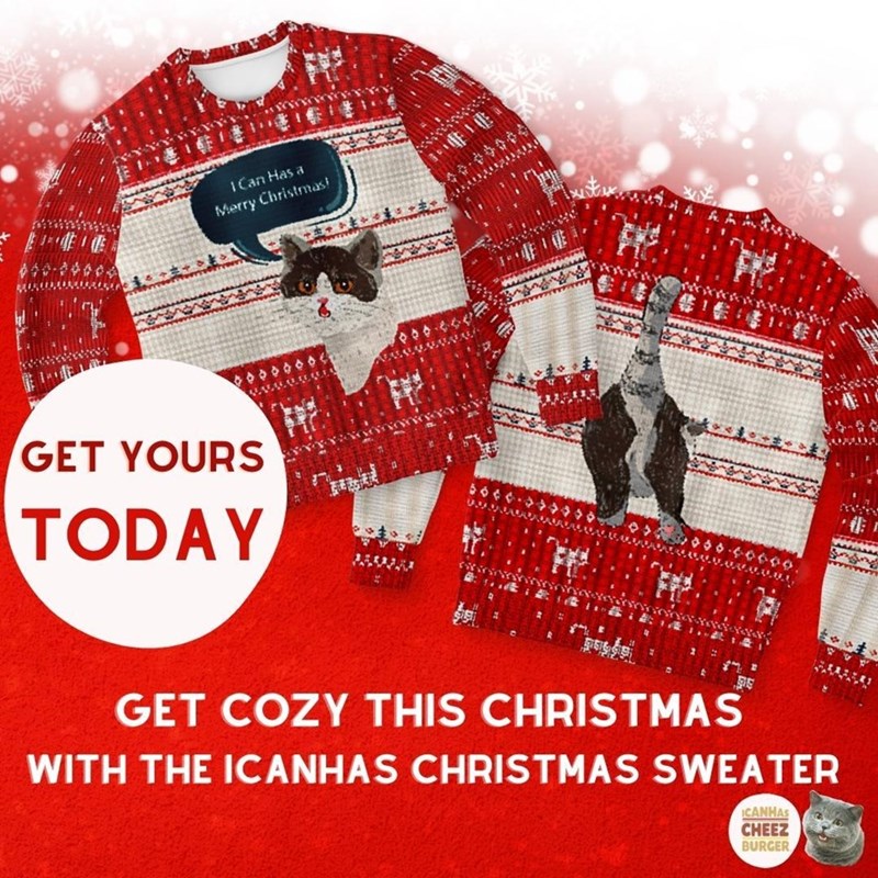 Christmas is right around the corner, and ICanHasCheezburger has got a brand new purrfect cat Christmas sweater! It's the kind of ugly Christmas sweater that not only makes you feel as if you're surrounded by the soft embrace of a cat at all times but that you will actually wear with PRIDE. Get one for you and a matching one for your cat, here!