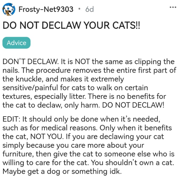 We feel like that second half of the post should be applied to everything - and not just about cat. Of course there are exceptions, but there is also the general rule. Declawing your cats when they are perfectly healthy and happy, just because they scratch your furniture, that's not something that is in any way okay.