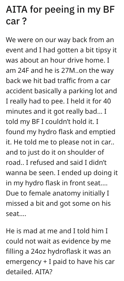 'I held it for 40 minutes and it got really bad': Couple fights after girlfriend goes to the bathroom in his car