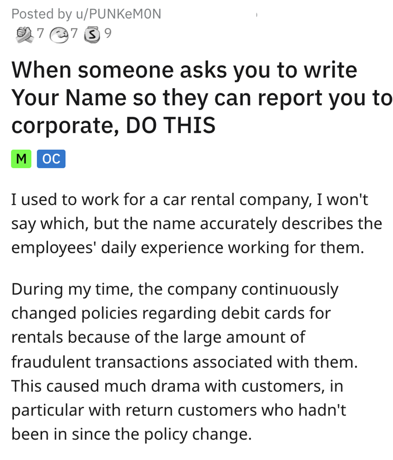 When u/PUNKeM0N was confronted by a raging Karen customer, they approached the situation with a cool and level head. The angry customer insisted that they write "your name" on a Post-It note so that they could report them to management. So that's exactly what u/PUNKeM0N did, writing "YOUR NAME" on the Post-It and handing it to the customer.