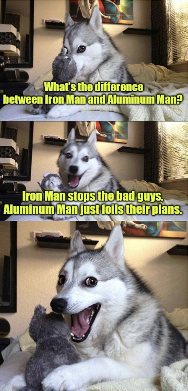 Okay, this one is actually quite clever. Could you imagine Aluminum Man? What would his super power be - keeping leftovers warm? Stopping pies from burning? Lining baking trays? Cleaning jewelry? We're out of uses for aluminum foil, got any other ideas?