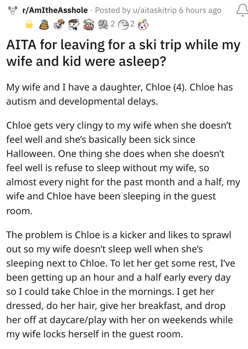 Imagine the cruel audacity to straight up ditch your wife and sick child at home — without letting them know where you're going — so that you can enjoy a last-minute ski trip with the boys. Then, when everyone in your life (except the boys) is telling you what an a**hole you are, you have the audacity to post about it online as if you've done nothing wrong.