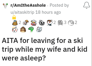 Parenting is a really challenging experience, but it's definitely easier if you have a partner you can rely on. If you have a partner that you're parenting with, the two of you can split the parenting responsibilities accordingly and discuss the future of your children together. However, if you have a partner that you can't rely on, then that's a whole 'nother story. In today's 'Am I the A$$hole?' post, OP proved that he's the kind of partner his wife shouldn't rely on. OP and his wife have a 4-year-old daughter with autism who happens to be sick at the moment. The fact that their daughter is sick obviously makes both their lives a little more stressful. Apparently, OP was invited to a ski trip with his friends and asked his wife if he could go to blow off some steam. She said no because she needed his help with their daughter, which led to him sneaking out while they were sleeping. Yikes! Scroll down to read the full story.