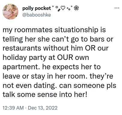 Controlling Situationship Tells Woman She Can't Attend Holiday Party In Her Own Apartment (Twitter Thread)