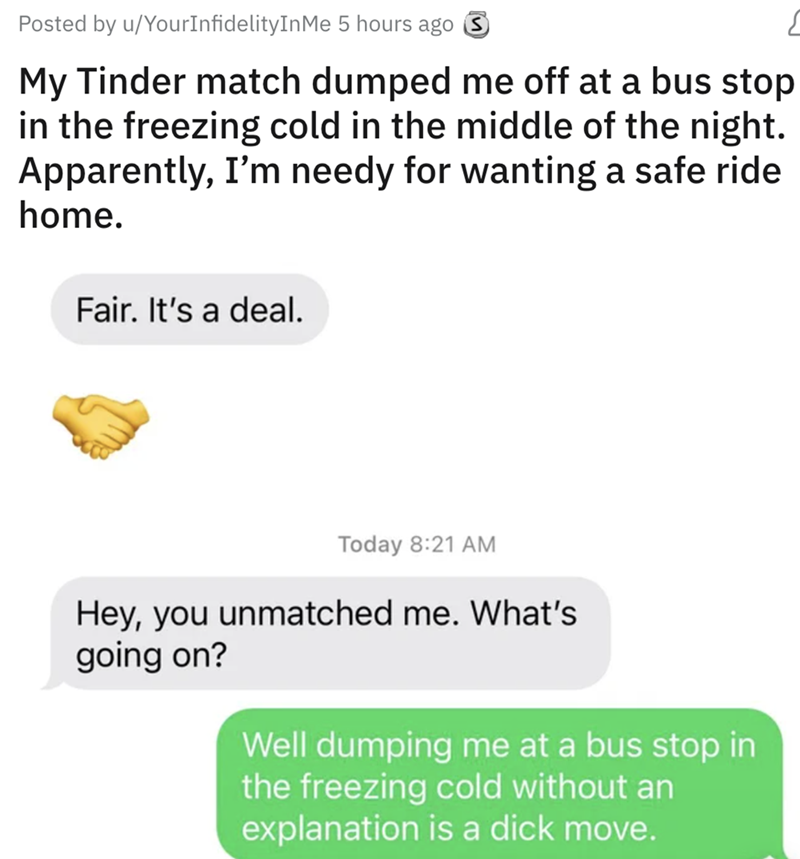 This "alpha" jerkoff didn't get the memo and left his date out in the cold (literally) in the middle of the night somewhere where she didn't feel safe. There's really no excuse for this type of behavior.