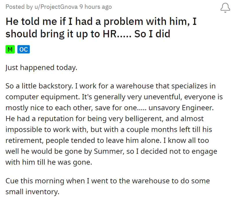 While scrolling through r/maliciouscompliance, I happened upon a post titled 'He told me if I had a problem with him, I should bring it up to HR..... So I did' — obviously intrigued to see what the dude had done, I began reading. If you're having issues with someone at work and want some inspiration of how to correctly deal with the AH, take some good ol' advice from Reddit, and more specifically, from this smart dude.