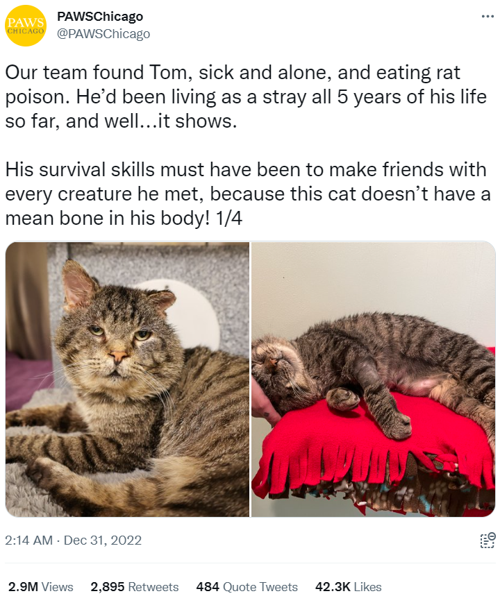 We hope that this sweetheart finds the loving and warm forever home that he deserves and that he continues to live a long and happy life. And thank you, of course, to PAWSChicago for taking care of him and nursing him back to health.