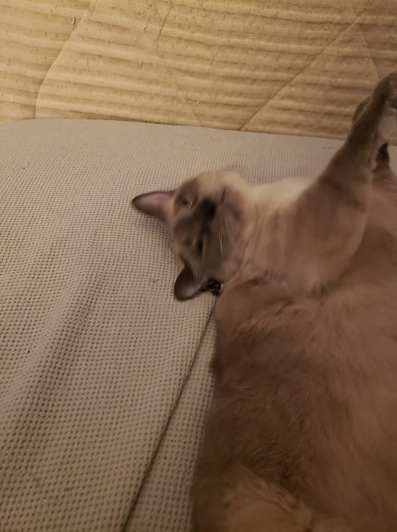 Audrey will also employ several ways to get me awake and up when she decides I should be: sticks her tongue up my nose, hooks one of my nostrils with one claw and pulls, bites my armpits, or drops a toy mouse in my mouth.