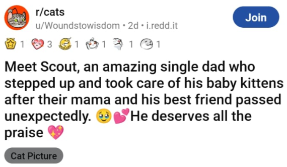 He really does deserve all the praise. And you, dear Reddit user, deserve all the praise for keeping these sweet cats together and not separating them. We hope that the kittens grow up strong and healthy - alongside their dad - and that the world is as kind to you from now on as you are to them.
