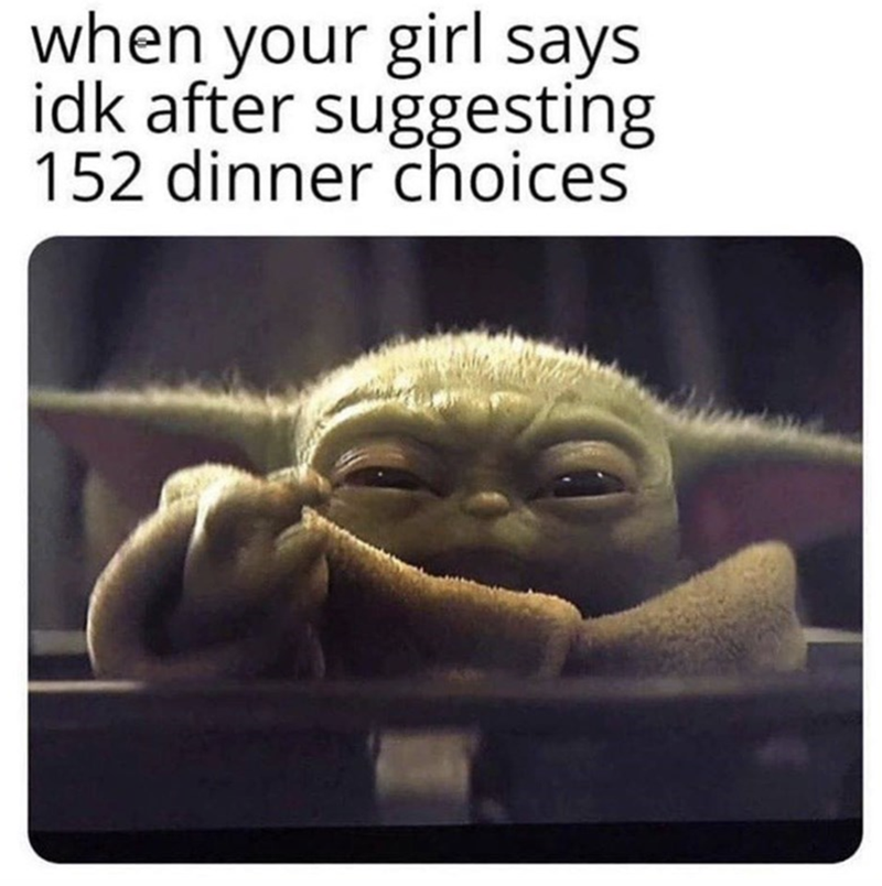 The moment y'all finally decide on something to eat is the moment the food party begins. Like looking in a mirror
