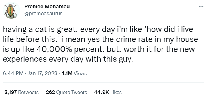 See? Someone who doesn't own a cat may look at this tweet and think that good god, having cats is insanity, and this person is clearly regretting their decision to get one. But they'd be wrong. This right here is love in its purest form. Every single cat owner feels this way, and every single one of us would do anything for our furbabies.