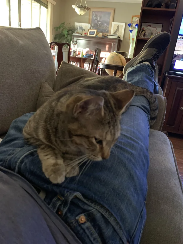 "Not my cat, I had just sat down and this cat came to sleep on me"