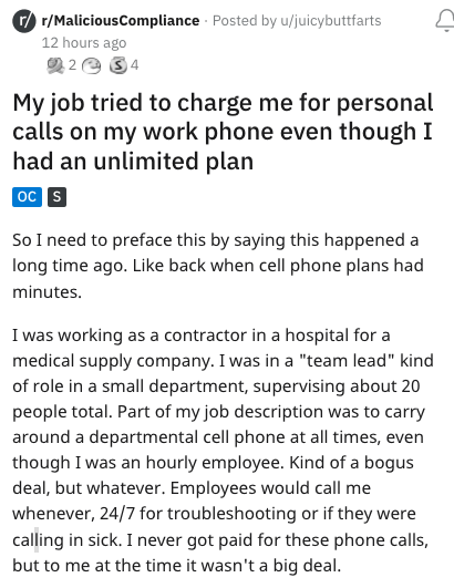 The phenomenally named Reddit user u/juicybuttfarts, had the former scenario occur when they were told they would have to start paying for their personal phone calls on their workplace's unlimited-minute cellular plan.