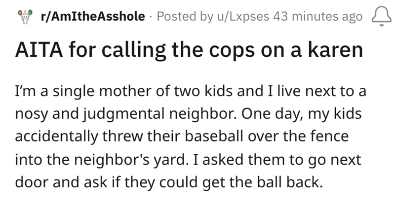 Karen blocks Single Mother's driveway, Single Mother calls the cops, Karen demands an apology