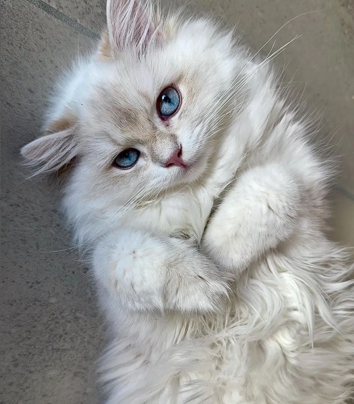 With its fluffy grey fur and big blue eyes, it's hard not to fall head over paws for this tiny feline. And just look at the way it's lying on its back, totally relaxed and ready for a belly rub!