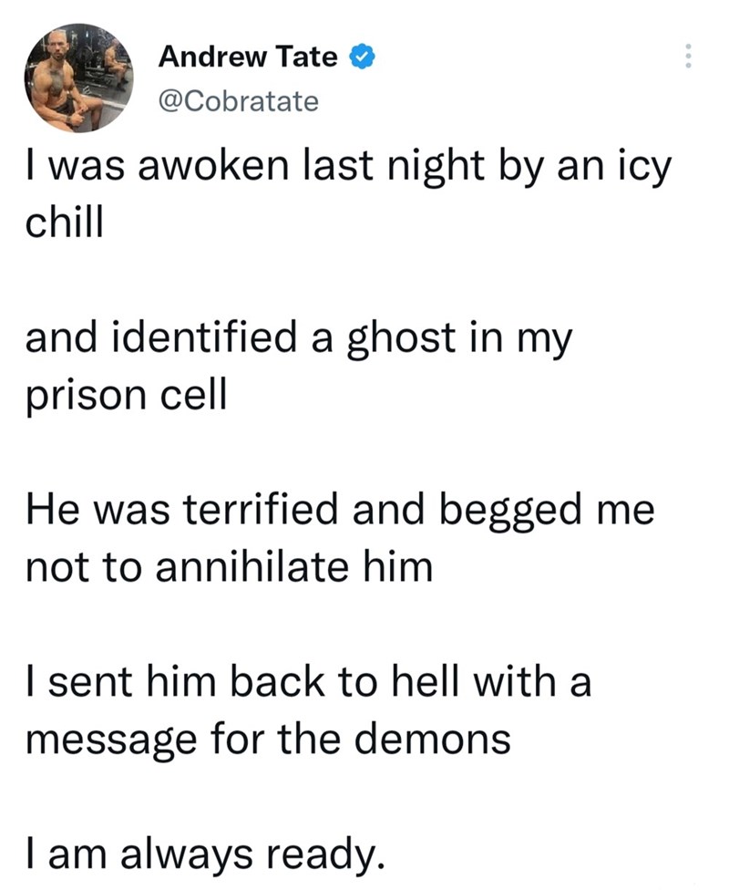 Andrew Tate Gets Mocked For Claiming to Fight Ghost in Prison Cell