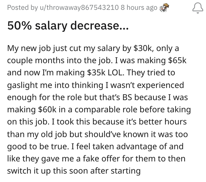 '50% salary decrease': New job cuts worker's pay by $30k shortly after recruiting them