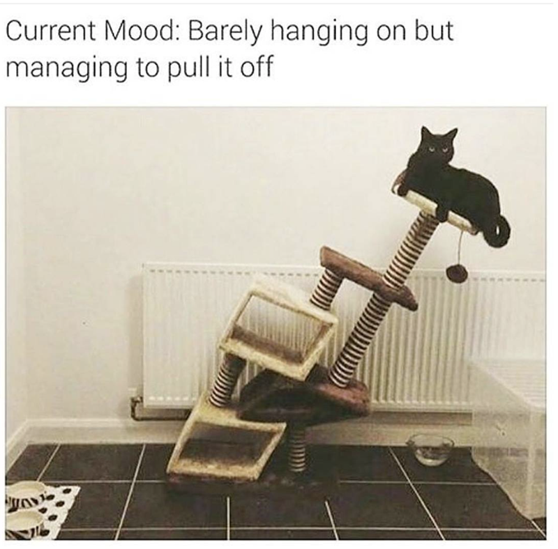 This is literally us. We are hanging on by one teensy tiny cat claw, and after that, the flood gates are open and all heck breaks loose. But somehow, we're still managing to stay above water…..for now.
