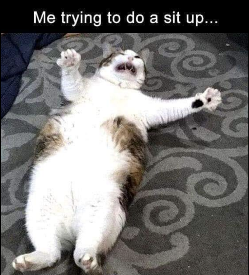 Listen, at least we're trying to exercise. We must get some points for that, right? It's hard, being a cat in today's world. Everyone expects you to be thin, graceful, and poised. Sometimes, we just want to eat a whole package of fancy feast and sleep for 3 days.