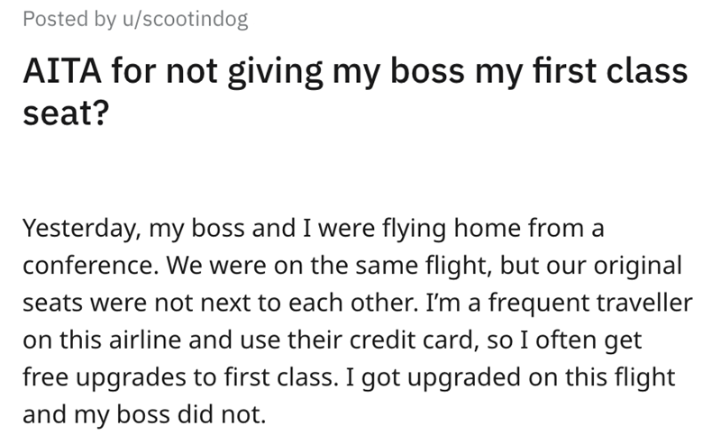 'AITA for not giving my boss my first class seat?': Internet defends worker's decision not to give their boss their personal seat upgrade