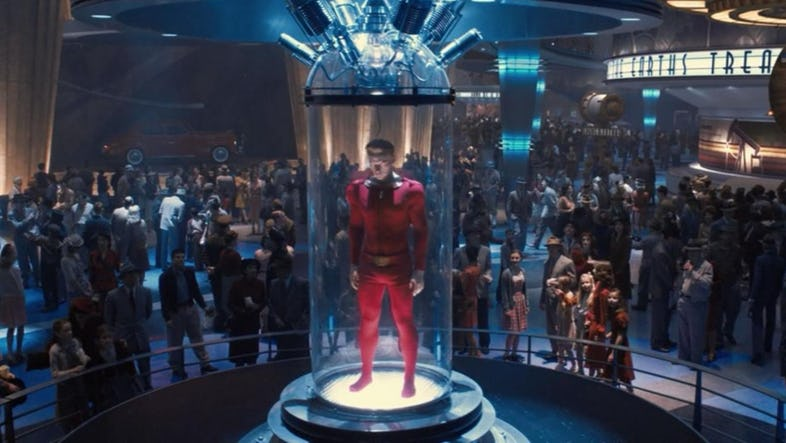 A billboard features Fin Fang Foom, a dragon-like creature from Marvel Comics, in the background during Tony's first flight scene.