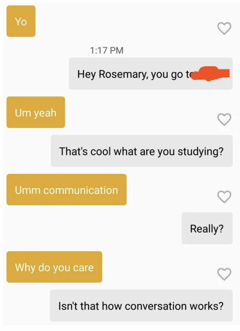 "Not sure if it’s just me, but for all you guys out there, do you think more girls will swipe right if you mention your ex in your profile? For me a big hard no."